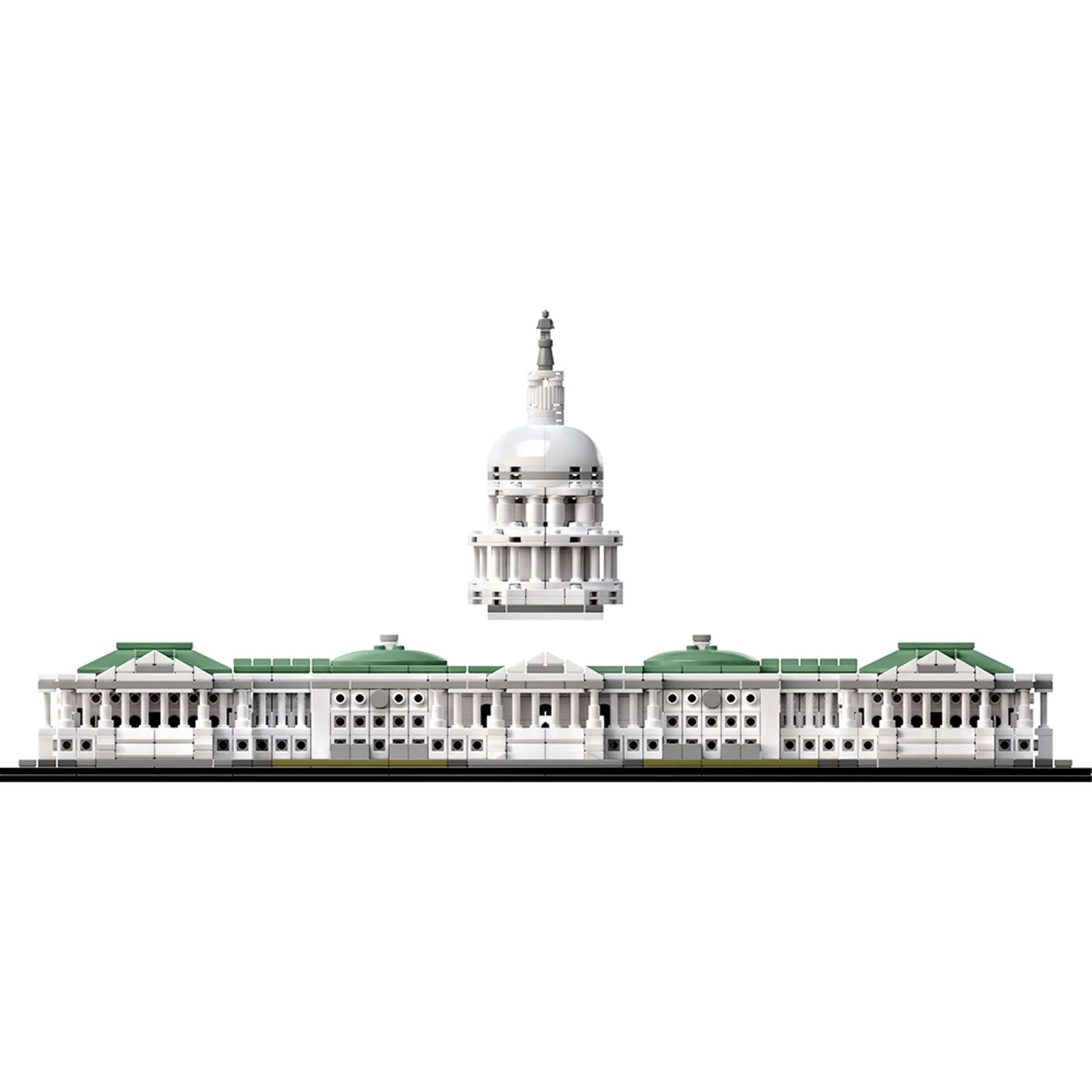 - Sættet indeholder Capitols neoklassicistiske facade, kuppel, søjlegange, nordlige og sydlige fløj, trappetrin og plæner.