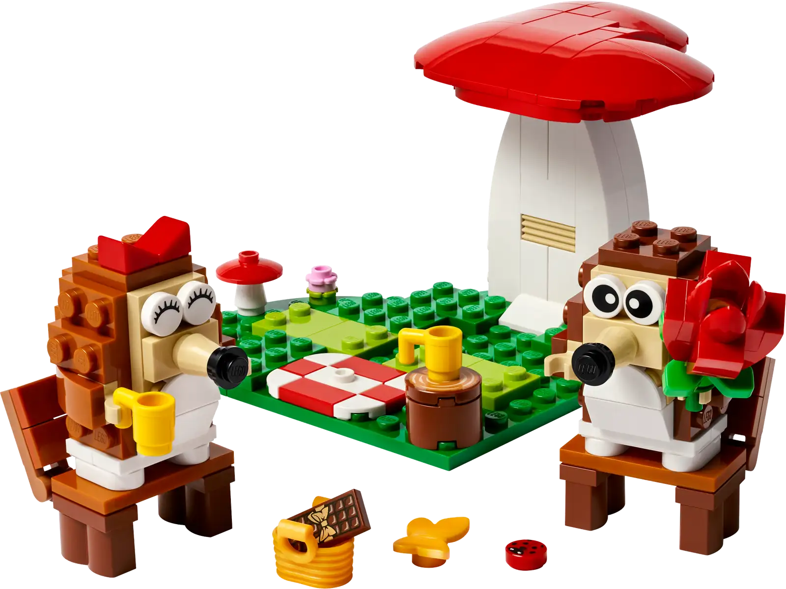 Det farverige LEGO byggesæt rummer masser af ekstra legeværdi for børn. Pindsvinene kan tages af bænken og stå frit, eller de kan sidde og nyde en picnic med et tæppe, en rose, kopper, en tærte og en gul sommerfugl. De har også poter, der kan holde kopperne.