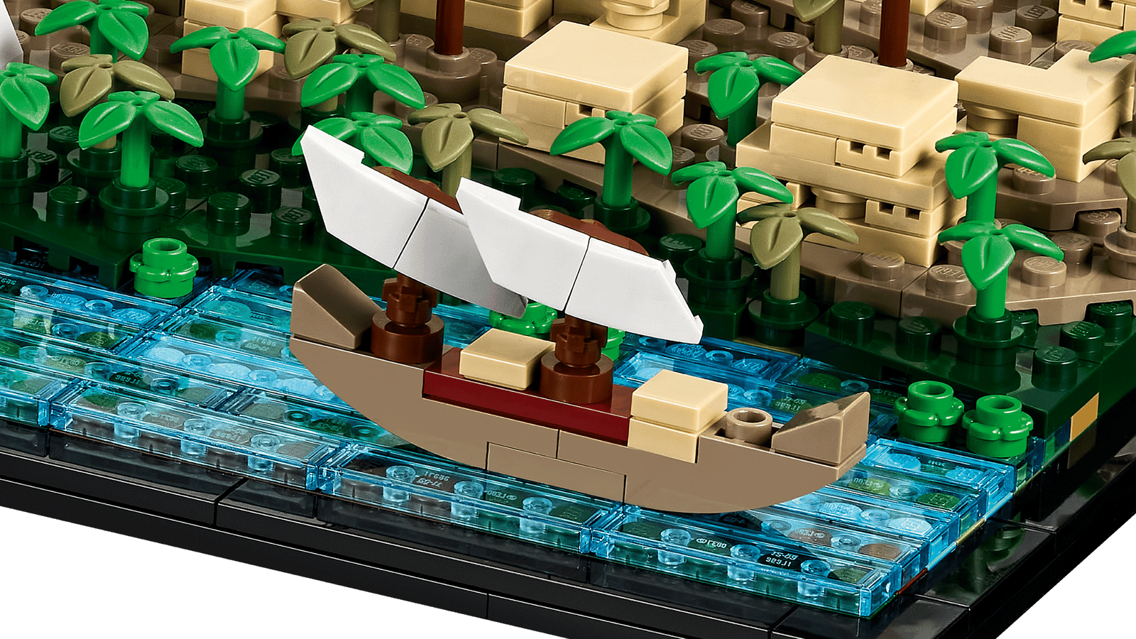 - Detaljeret landskab – En del af Nilen med 2 LEGO® klodsversioner af feluker (gammeldags både), 2 små pyramider, 2 dødstempler, sfinx-statuer, en landsby til arbejdere og en obelisk