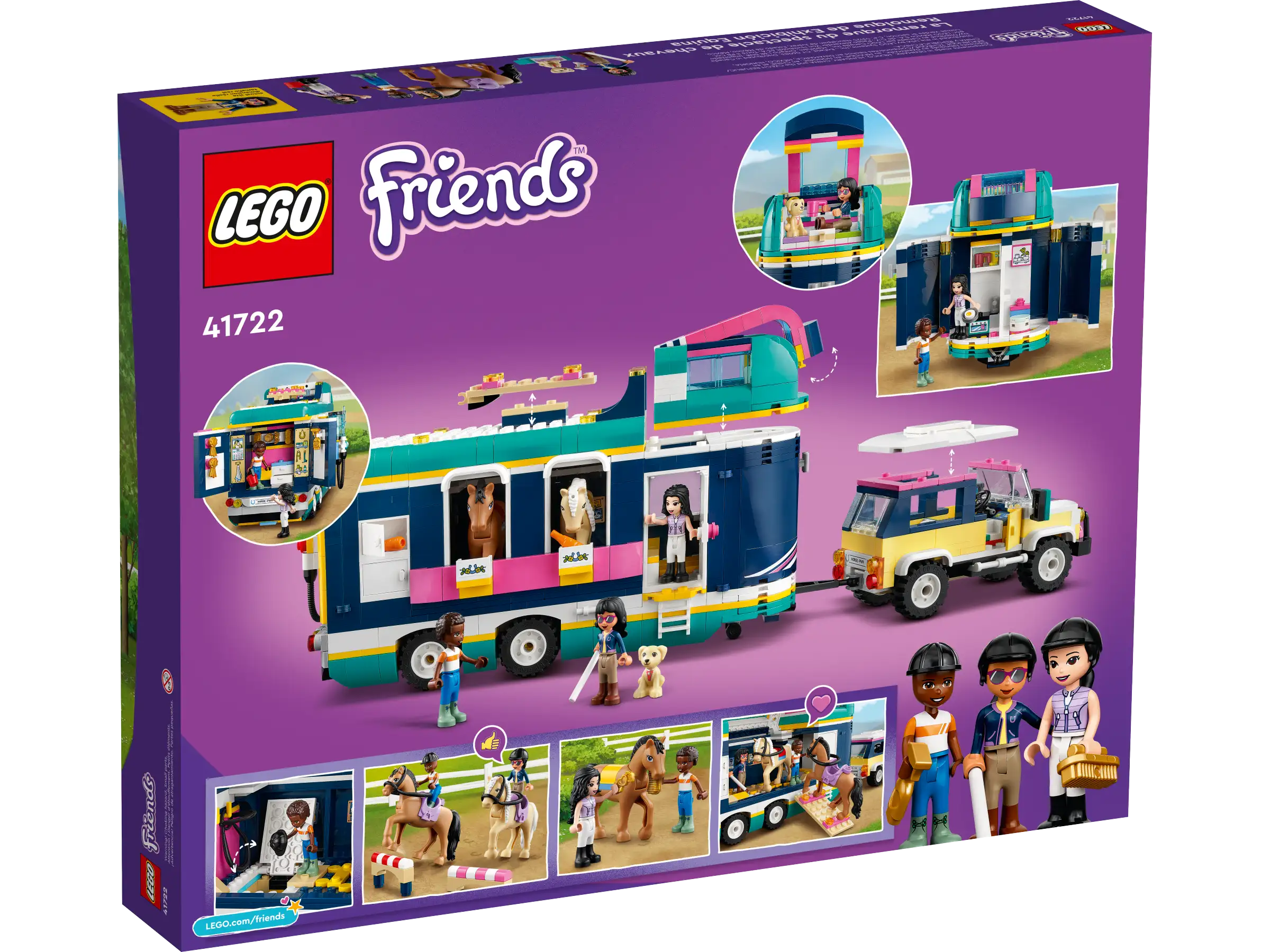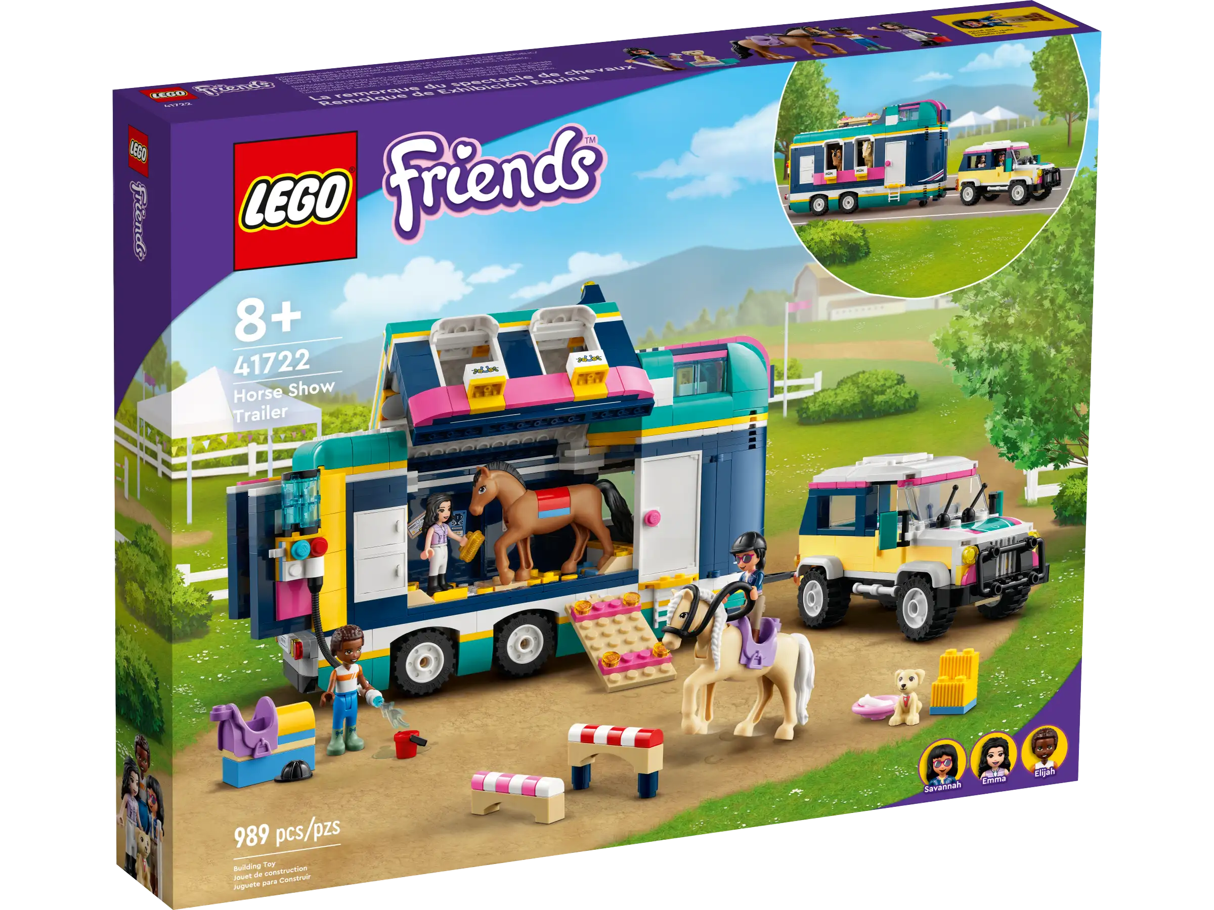 Vennerne er på farten på vej til rideshows. Deres cool trailer indeholder alt, hvad de behøver til turen. Der er en bås til de 2 hestefigurer og et rum med alt rideudstyret, såsom seletøj og hjelme. Der er endda et soveområde, hvor Emma og hendes LEGO venner kan ligge om natten. Den smarte SUV med træk er køreklar og har plads til de 3 figurer samt Savannahs førerhund.