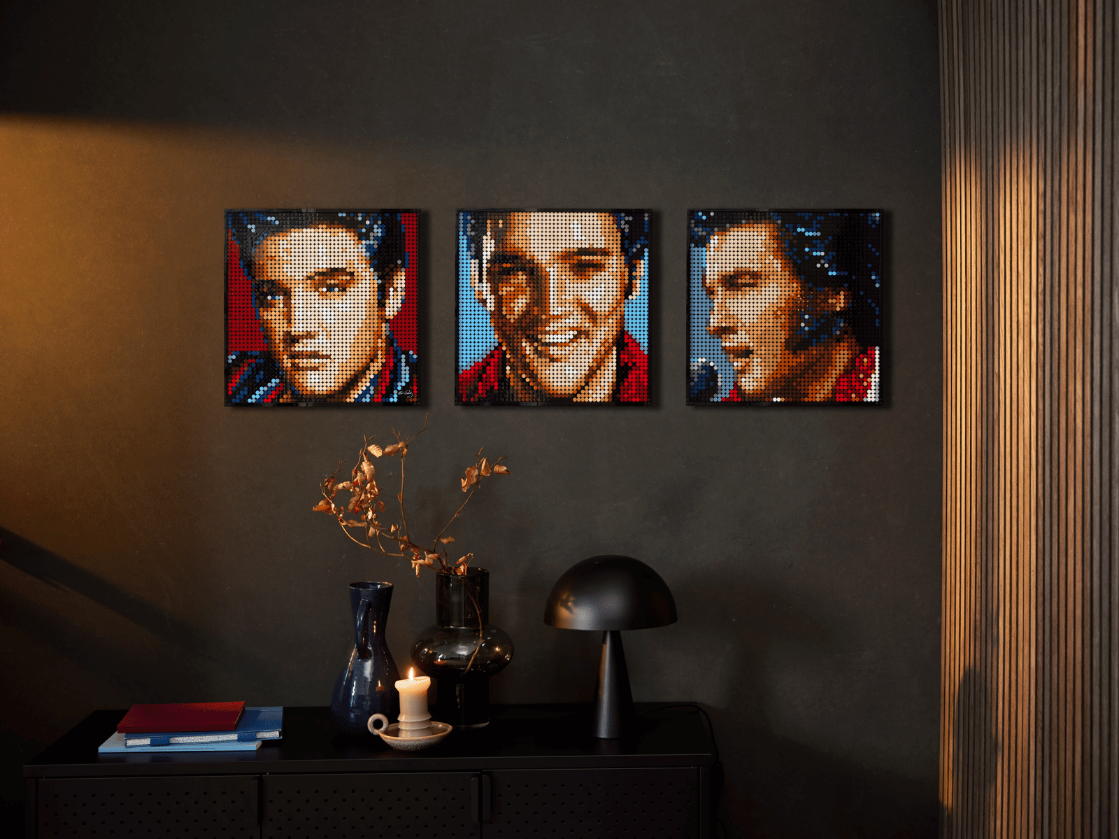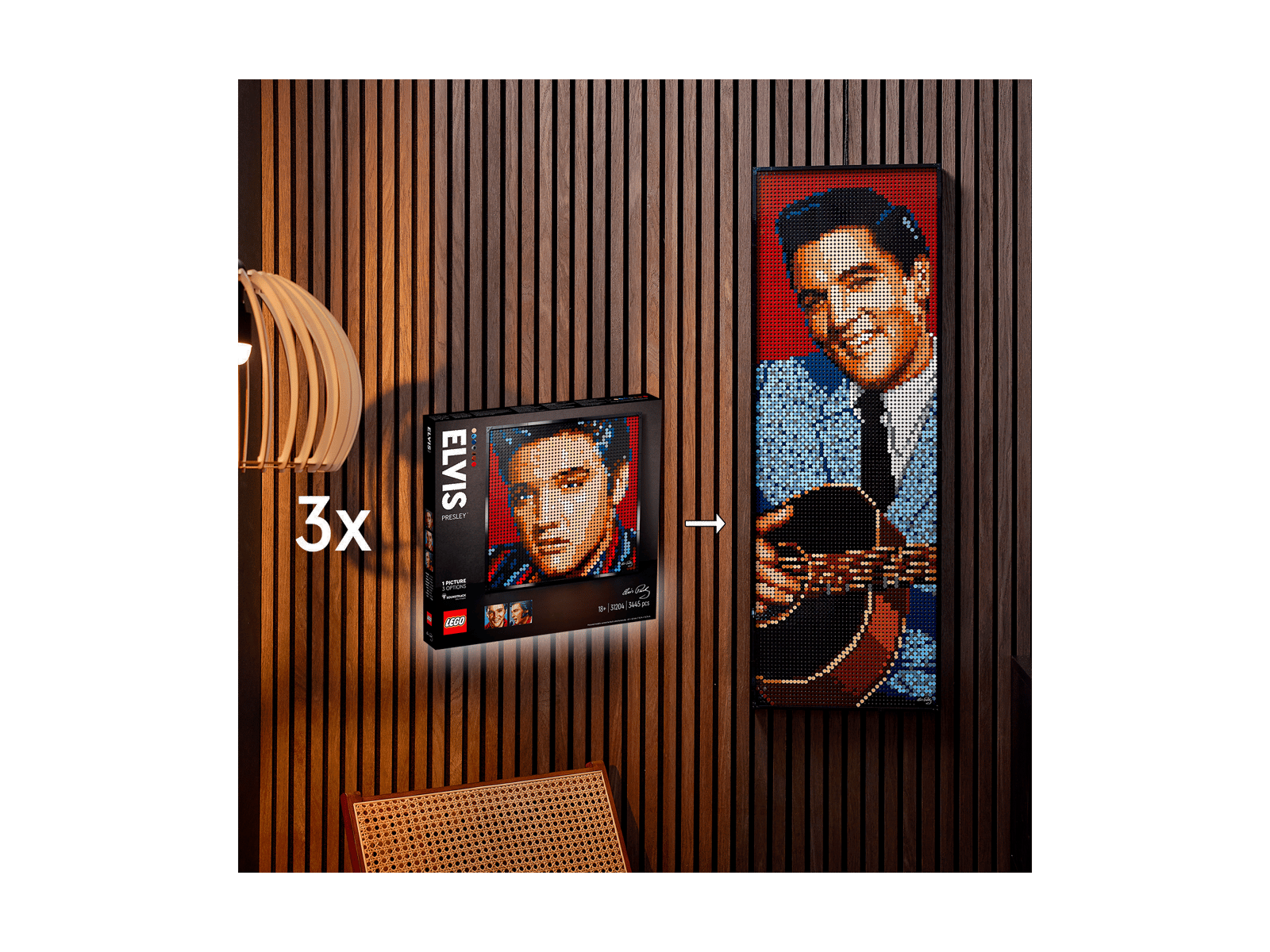 - Lavet til udstilling – Dette LEGO® hobbyprojekt med 3.445 elementer indeholder 9 plader til vægophængning, en Elvis Presley-signaturmosaik, 2 ophængningselementer, en elementadskiller og en klodsbygget ramme