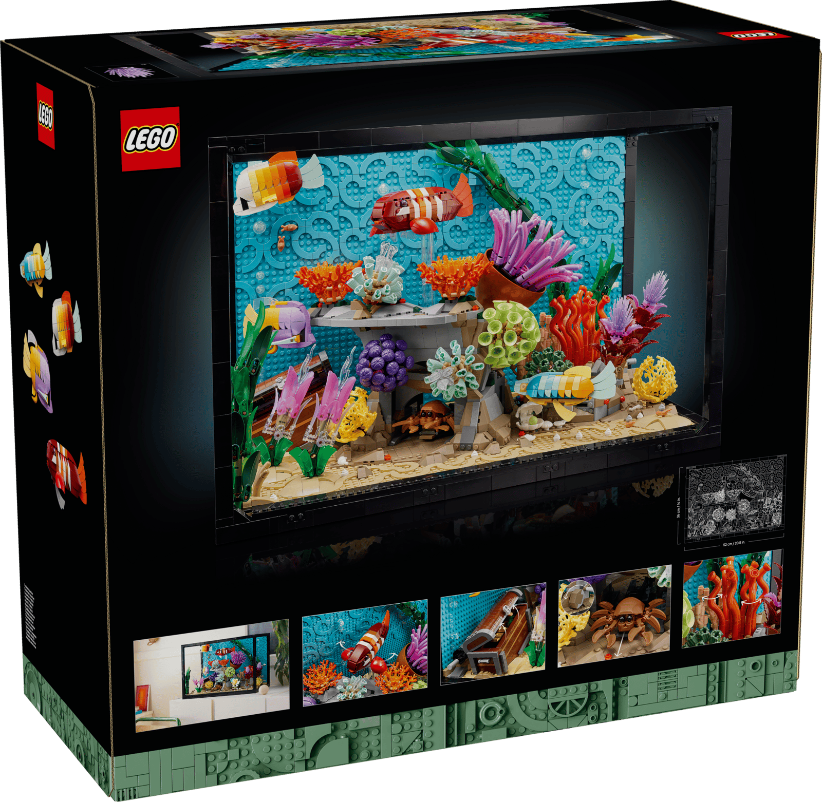 - Størrelse – Fiskeakvariet i LEGO® byggesættet med 4.154 elementer er over 36 cm højt, 52 cm bredt og 28 cm dybt