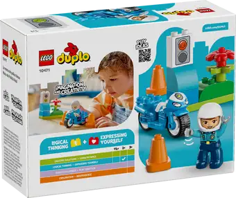 - POLITI-LEGESÆT – LEGO® DUPLO® By-sættet Blå politimotorcykel (10471) er en god gave til små børn fra 2 år, så de kan udspille spændende historier med en legetøjsmotorcykel, en politifigur, trafikkegler og trafiklys