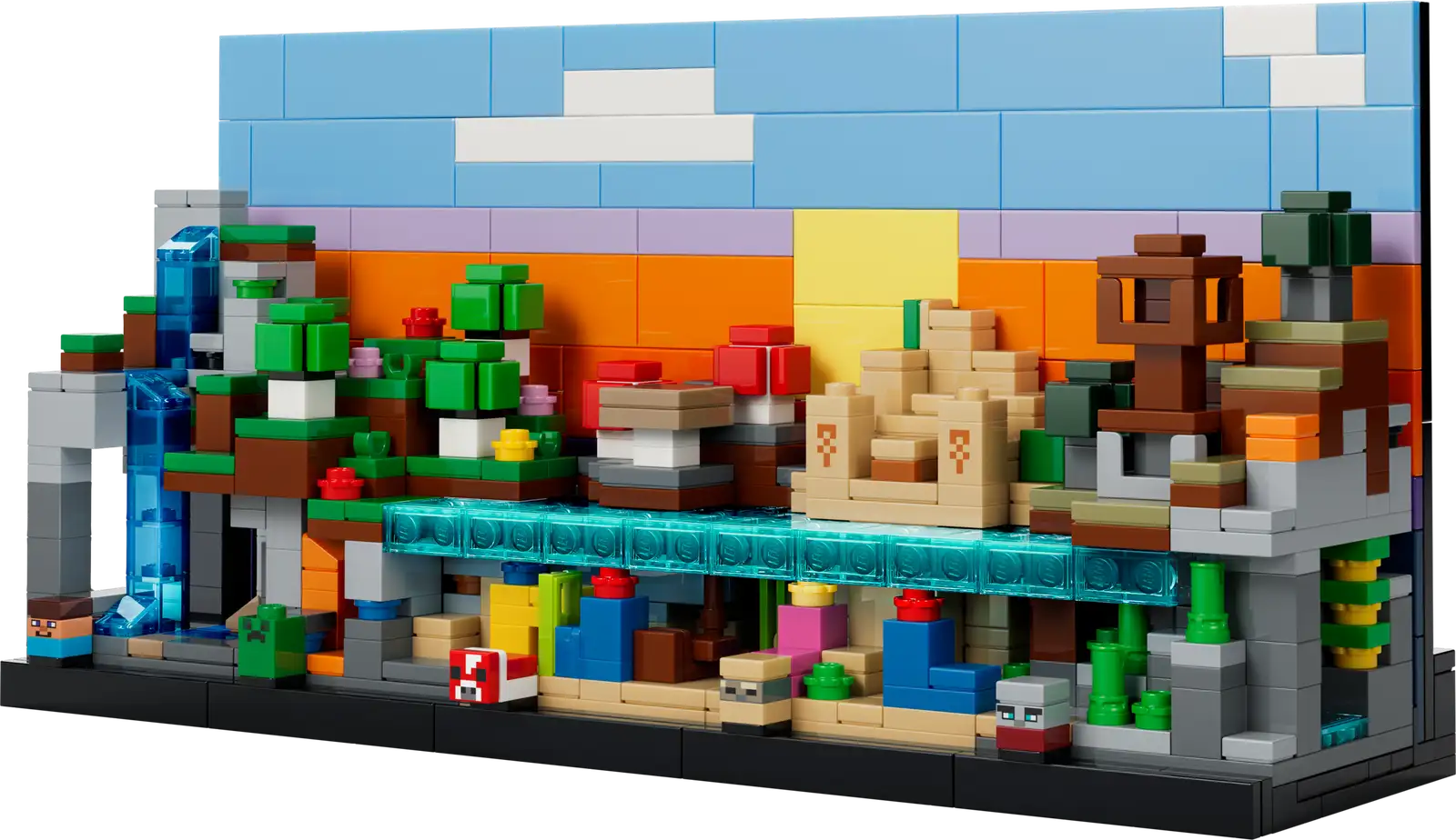 - LEGETØJ MED 5 BIOMER OG MINECRAFT®-FIGURER – LEGO® sættet indeholder bjerg-, blomsterskov-, svampe-, ørken- og savannebiomer samt mikrofigurer af Steve, Creeper™, mooshroom, skal og røver
