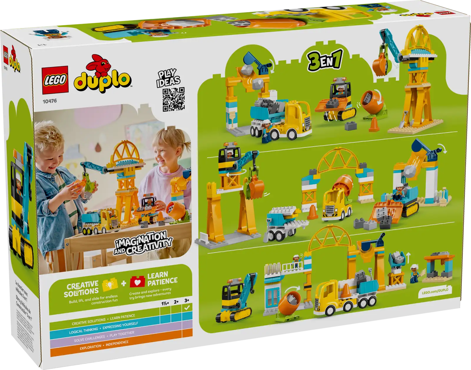 - LEGO® DUPLO® 3-I-1-SÆT – Små børn har uendelige muligheder for at lege, bygge og ombygge legetøj som f.eks. en bro, som lastbiler kan køre under, en læsseport eller en kran med en bevægelig arm og en gribeskovl