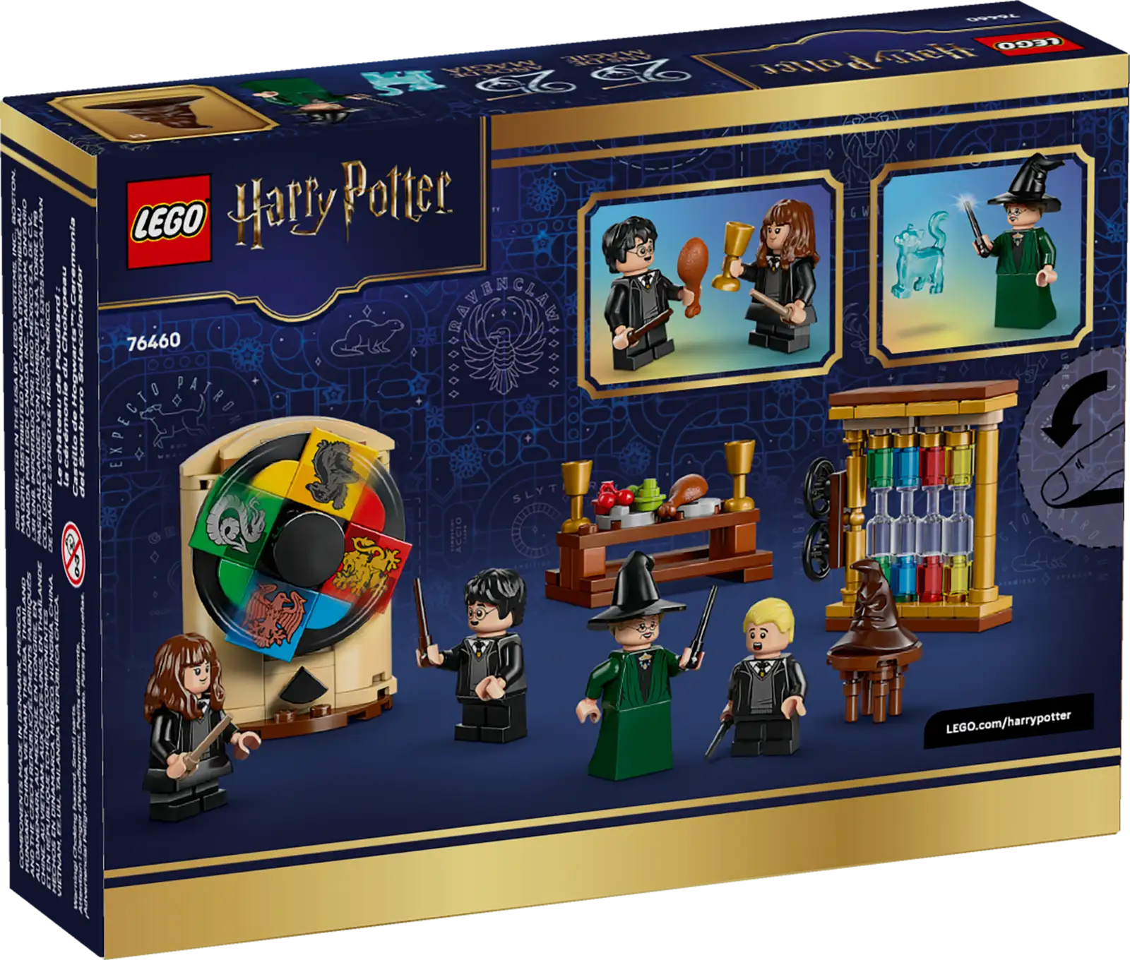 Genoplev Fordelingshat-ceremonien på Hogwarts™-slottet fra Harry Potter og De Vises Sten med et LEGO® Harry Potter™ byggesæt (76460) til børn. Den sjove Harry Potter-legetøjsgave til drenge, piger og fans fra 7 år har 4 LEGO Harry Potter minifigurer: professor McGonagall™, Harry Potter, Hermione Granger™ og Draco Malfoy™. Sæt Fordelingshatten på hver elev, og drej på "fordelingshjulet" for at finde ud af, hvilket Hogwarts-kollegie de skal tilhøre. Et spisebord og en kollegiepoint-tæller øger legemulighederne. Det eventyrlige sæt til børn er en hyldest til det allerførste LEGO Harry Potter sæt (4701), der udkom i 2001, og indeholder én 25-års jubilæumspatronus i en serie af flere, der kan samles: Professor McGonagalls katte-patronus. Sættet passer ind i Hogwarts-slottet: Storsalen (76435), endnu et sæt i samlingen af modulopbyggede legetøjssæt (sælges separat), som tilsammen skaber den mest detaljerede klodsbyggede scene til dato af LEGO Hogwarts-slottet. Byggesættet omfatter 124 elementer.