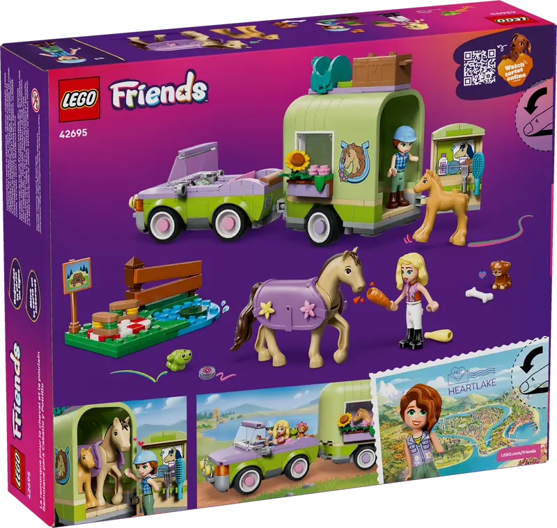 Lad børn fra 7 år nyde timevis af rolleleg med dyrepasning med LEGO® Friends byggelegetøjet Heste- og føltrailer (42695). Sættet til hestevenner indeholder 2 minidukker og 4 figurer: hest, føl, hundehvalp og frø. Udforsk livet med heste ved hjælp af detaljerigt tilbehør til at strigle hestene, transportere dem i traileren, ride og øve spring. Piger og drenge kan lege med dyresættet på mange forskellige måder. De kan finde på historier om Autumn og Matilde, når de kører med bilen. Åbn trailerenfor at hilse på hesten og føllet. Hesten kan sadles, så den er klar til en ridetur. Der er en lille sidemodel med bl.a. picnicområde, sø, skilt og et hegn, hesten kan hoppe over. Sættet er en sej gave til hestefans og en sjov fødselsdagsgave til børn, der elsker legetøjsdyr. Og med LEGO Builder appen kan børn nyde et nemt og intuitivt byggeeventyr, hvor de kan zoome ind på og dreje modeller ved hjælp af 3D-vejledning, gemme sæt og se deres byggefremskridt. Byg-selv-sættet indeholder 279 elementer.
