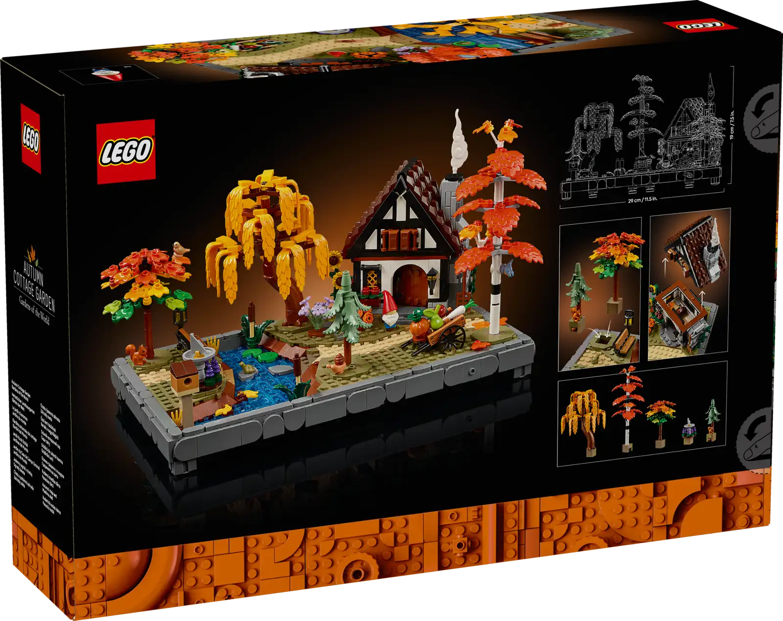 Denne tilføjelse til Verdens haver-samlingen er inspireret af hytter fra eventyrbøger og omfatter et birketræ, en gråpil, en blågran, en ahorn og efterårsblomster. Indret haven med et solur, et fuglehus, en grøntsagsvogn, en havenisse og et vandløb med trædesten. Tilføj en hytte med et hyggeligt køkken, og fuldend modellen med en rødhals, en spætmejse, et egern, en frø og en snegl, der gør modelsættet til en perfekt gave til voksne fans af kreativ boligindretning.