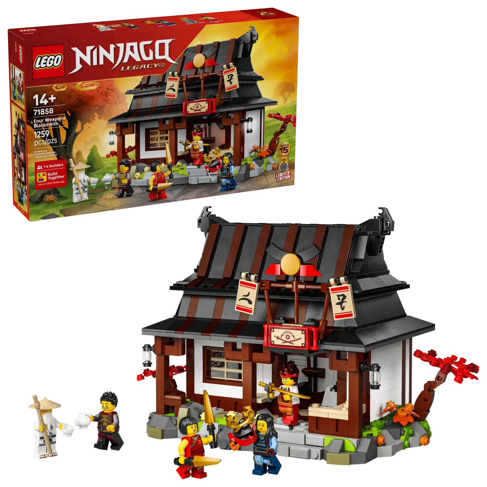 Fejr LEGO® NINJAGO® tv-serien med byggesættet De Fire Våben-smedjen – 15-års jubilæum (71858). Drenge, piger og nostalgiske fans fra 14 år kan glæde sig til for første gang at kunne bygge, udstille og genskabe handlingen fra LEGO NINJAGO tv-serienmed den ikoniske smedje – det første sted, man ser i pilotafsnittet. Åbn bagsiden af ninjalegetøjet for at afsløre et soveværelse og en smedje fyldt med detaljer og tilbehør fra serien. I legetøjssættet kan børn finde ninja-klistermærker, der gemmer si g bag udstillede hjelme og hætter, og trykke på et skilt for at afsløre kortet over de gyldne våben. Sættet indeholder 6 minifigurer af tv-seriens karakterer: Maya, Ray, Nya, smed-Kai, mester Wu samt for første gang et samlerobjekt af jordens elementmester på en stand. Børn kan bygge hvert legesæt med selvtillid ved hjælp af LEGO Builder appen, hvor de kan zoome, dreje i 3D og følge deres fremskridt med letforståelig digital vejledning. Byg-selv-sættet indeholder 1.259 elementer.