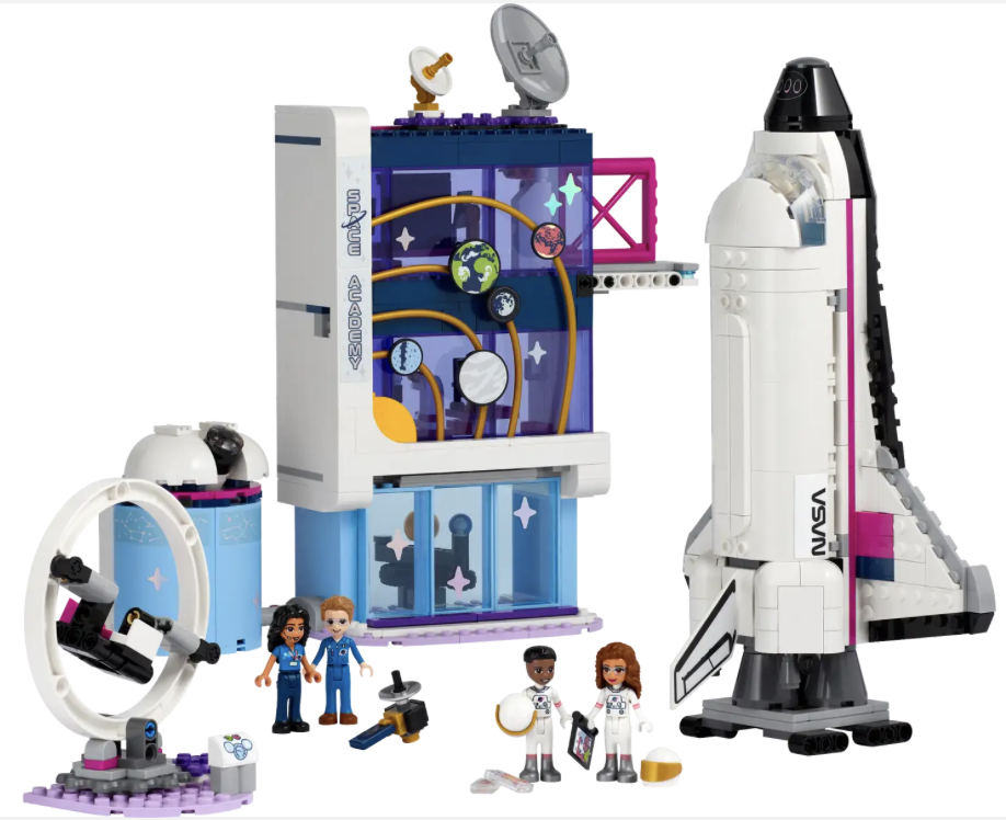 - Legetøj med rumskibstema og autentiske detaljer – Dette sæt indeholder detaljer fra rumfærgeprogrammet, f.eks. en rumfærgemodel, en akademibygning, et teleskop og 4 LEGO® Friends figurer