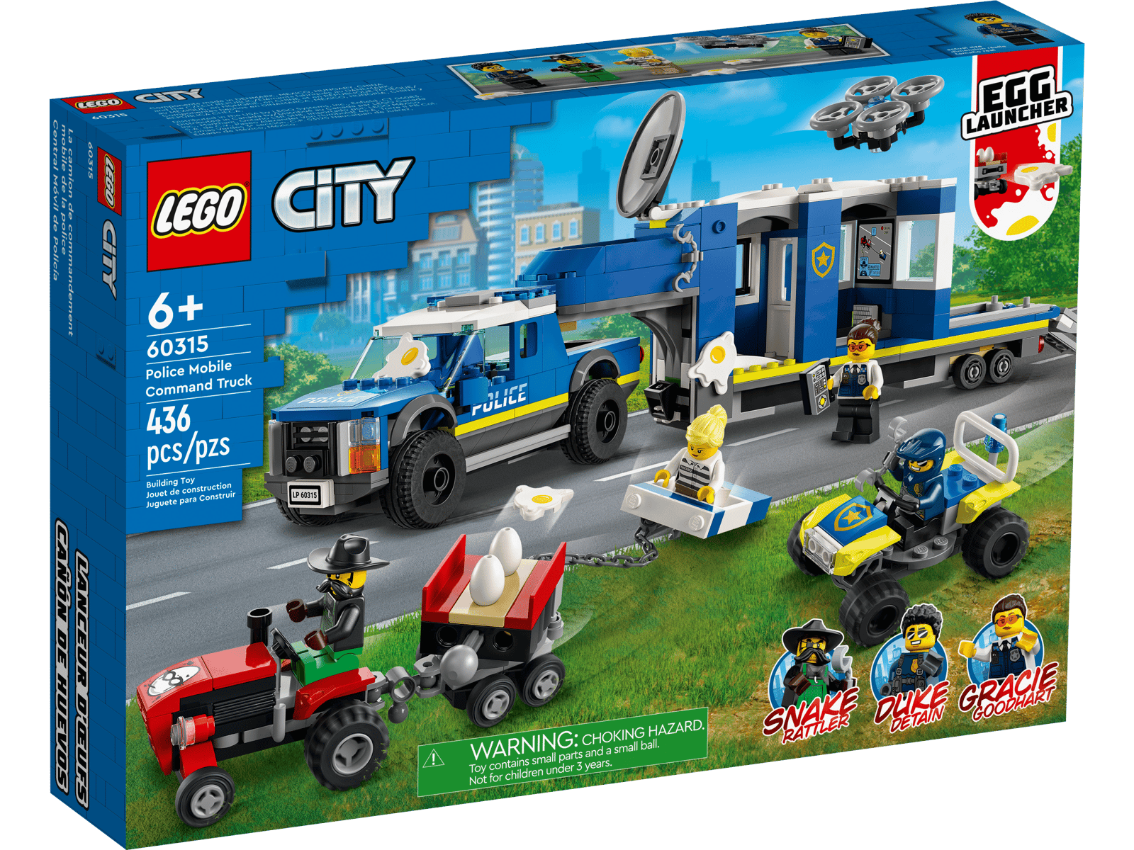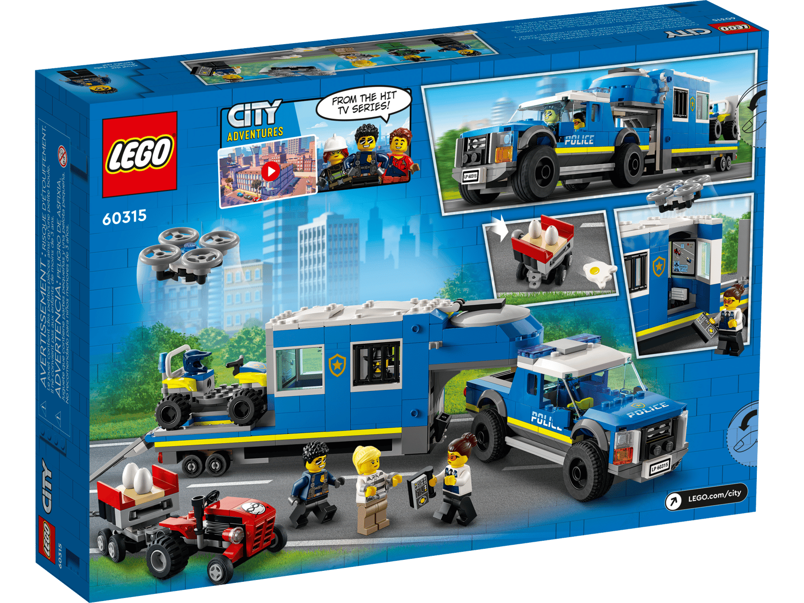 Børn kan skabe deres egne historier fra tv-serien LEGO® City Adventures med legesættet Mobil politikommandocentral (60315). Det er fyldt med fantastiske detaljer, spændende funktioner og seje fartøjer, bl.a. politiets pickup og trailer med fængsel, drone og ATV, samt skurkenes traktor og trailer med æggesplat-affyrer. Bare tilføj minifigurerne af Duke DeTain, Gracie Goodhart og Snake Rattler, og lade den sjove leg begynde!