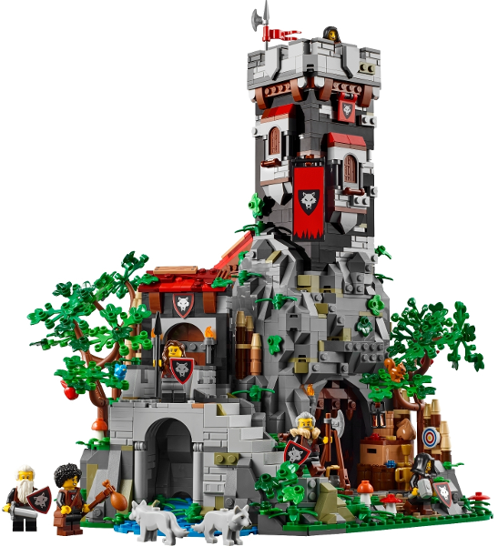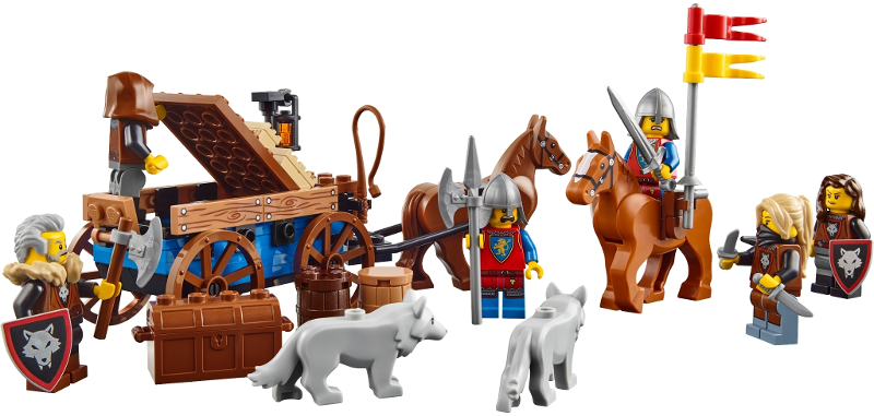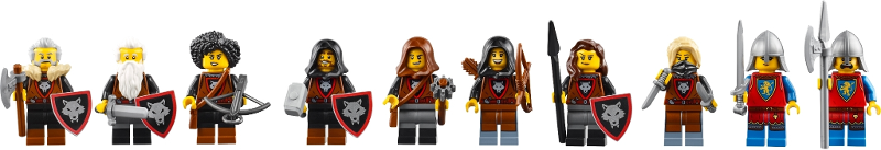 Minifigures: The model includes 8 Wolfpack outlaws, two Lion Knights, two wolves, two horses, a bird, and a squirrel.