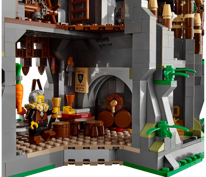 The cave entrance is protected by a fully operational portcullis and has plenty of space for the outlaws to store their treasures. The Outlaw Forest Den is designed to be both modular and openable. To allow better access to the interior, the tower section can be opened and removed, the rocks in front of the vault can be cleared, and the entire back section swings open. To reach the tower above the cave, attackers must cross a narrow bridge guarded by a secret trapdoor. In case of an attack, the outlaws can use a hidden escape door at the back to avoid capture.