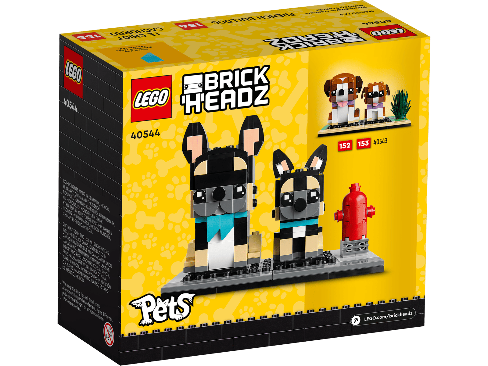 Dyreelskere vil være begejstrede over at bygge og lege med denne LEGO® BrickHeadz™ Fransk bulldog (40544). De nuttede modeller af en Fransk bulldog og hvalp er begge iført supersøde blå tørklæder og sidder ved siden af en rød brandhane, der kan bygges. Børn fra 8 år kan udstille dem på værelset på en byggeplade eller tage dem af for at udspille sjove eventyr.