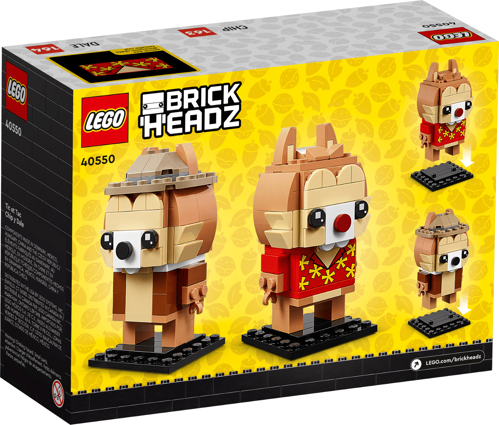 - Tegnefilmsfigurer i klodsform – LEGO® BrickHeadz™ ǀ Disney Chip & Chap (40550), der kan bygges i hver deres ikoniske outfit fra Disneys Chip & Chap: Nøddepatruljen