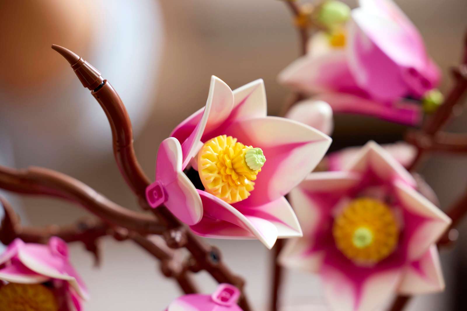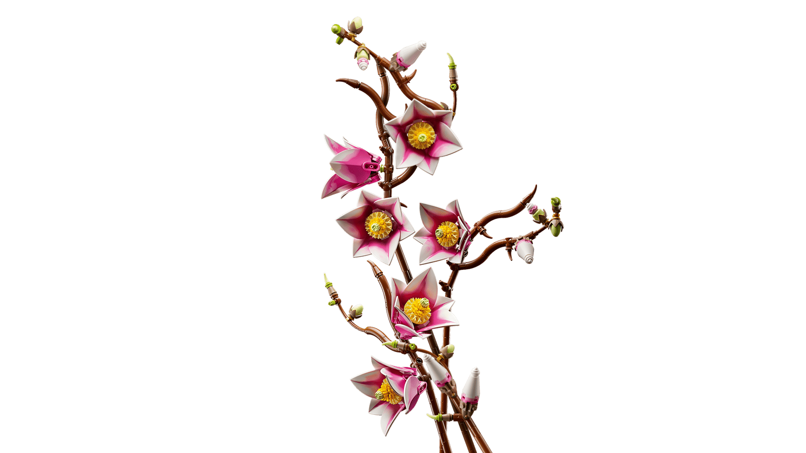 - LEGO® MAGNOLIAER – Byggesættet indeholder 5 magnolia-grene, hvoraf 2 viser blomstens fulde udvikling fra en lille knop til en åben blomst med udfoldede kronblade