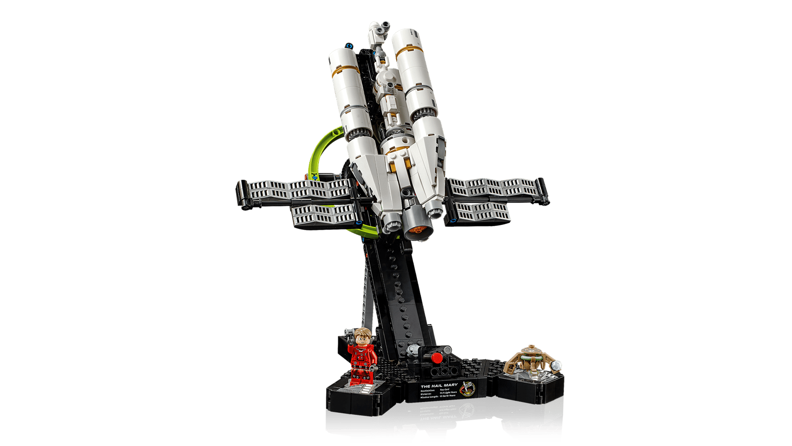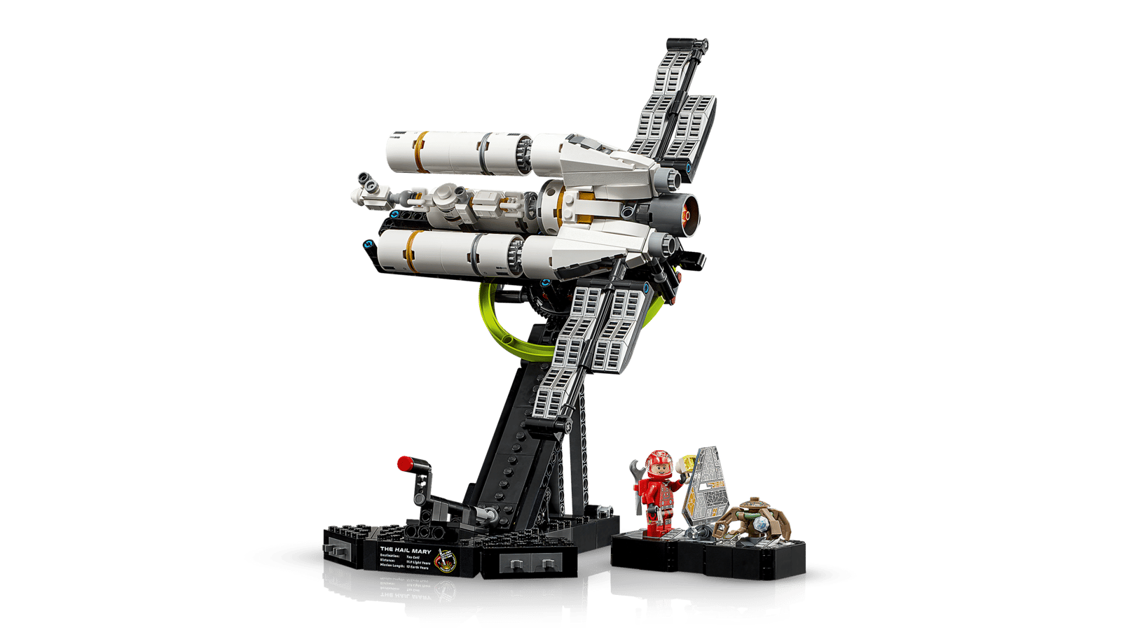 - HVAD ER DER I ÆSKEN? – Alt, hvad du skal bruge til at bygge en mikrokopi af rumskibet Hail Mary, en funktionel udstillingsstand samt en minifigur af Ryland Grace og en Rocky-figur