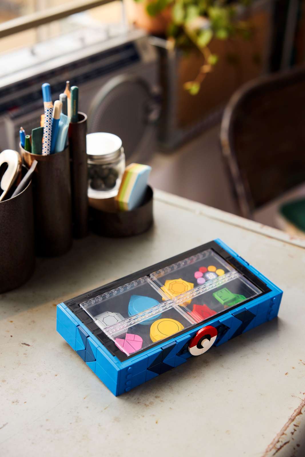 - 8 POKÉMON-KAMPBADGES – Den klodsbyggede udstillingsboks indeholder Kanto-regionens træningscenter-badges for Klippe, Kaskade, Torden, Regnbue, Sjæl, Sump, Vulkan og Jord, sikret med en lukkemekanisme inspireret af en Poké Ball