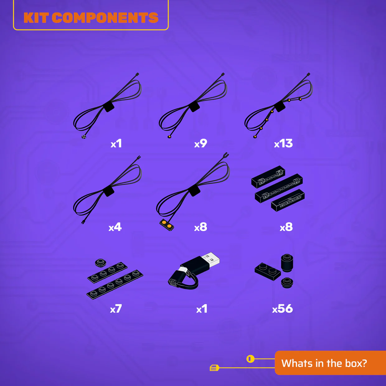 - All component casing and housing has been designed to connect seamlessly onto the LEGO stud system, with LEGO dimensional parts.