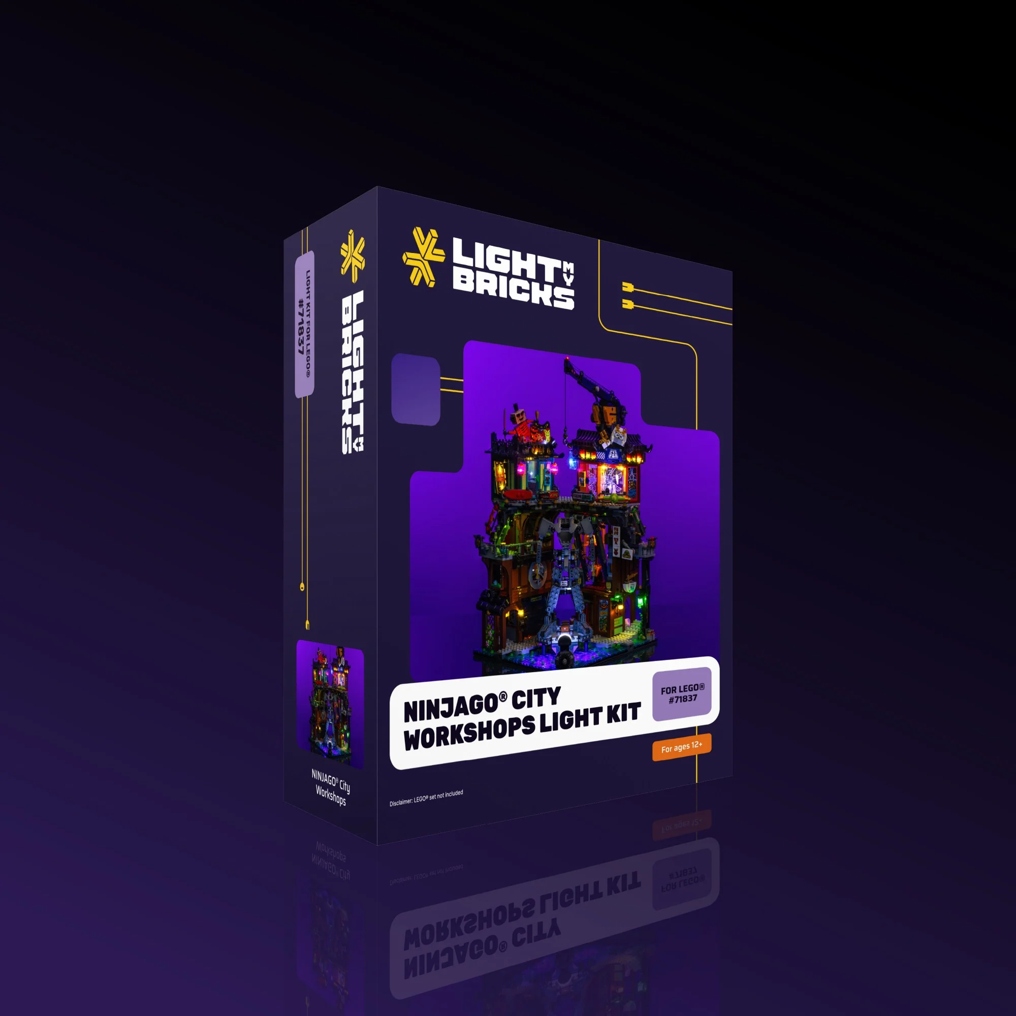 Light up your NINJAGO City Workshops LEGO® build with dynamic, mood-setting lighting. Light My Bricks™ cool white Solar light highlights the mech platform and futuristic design.