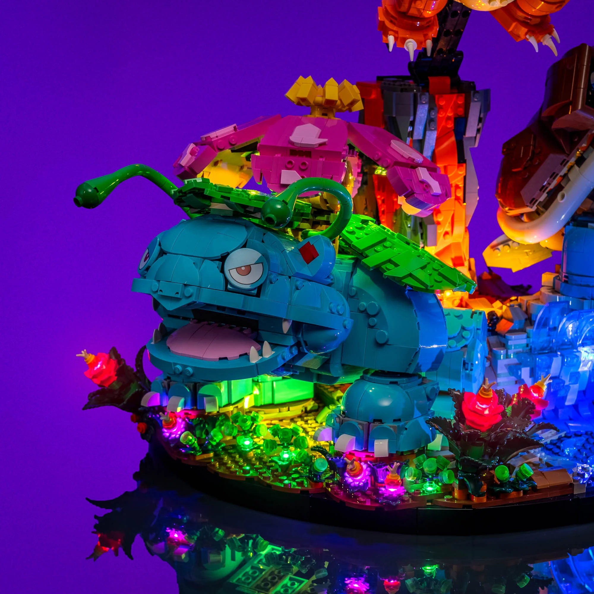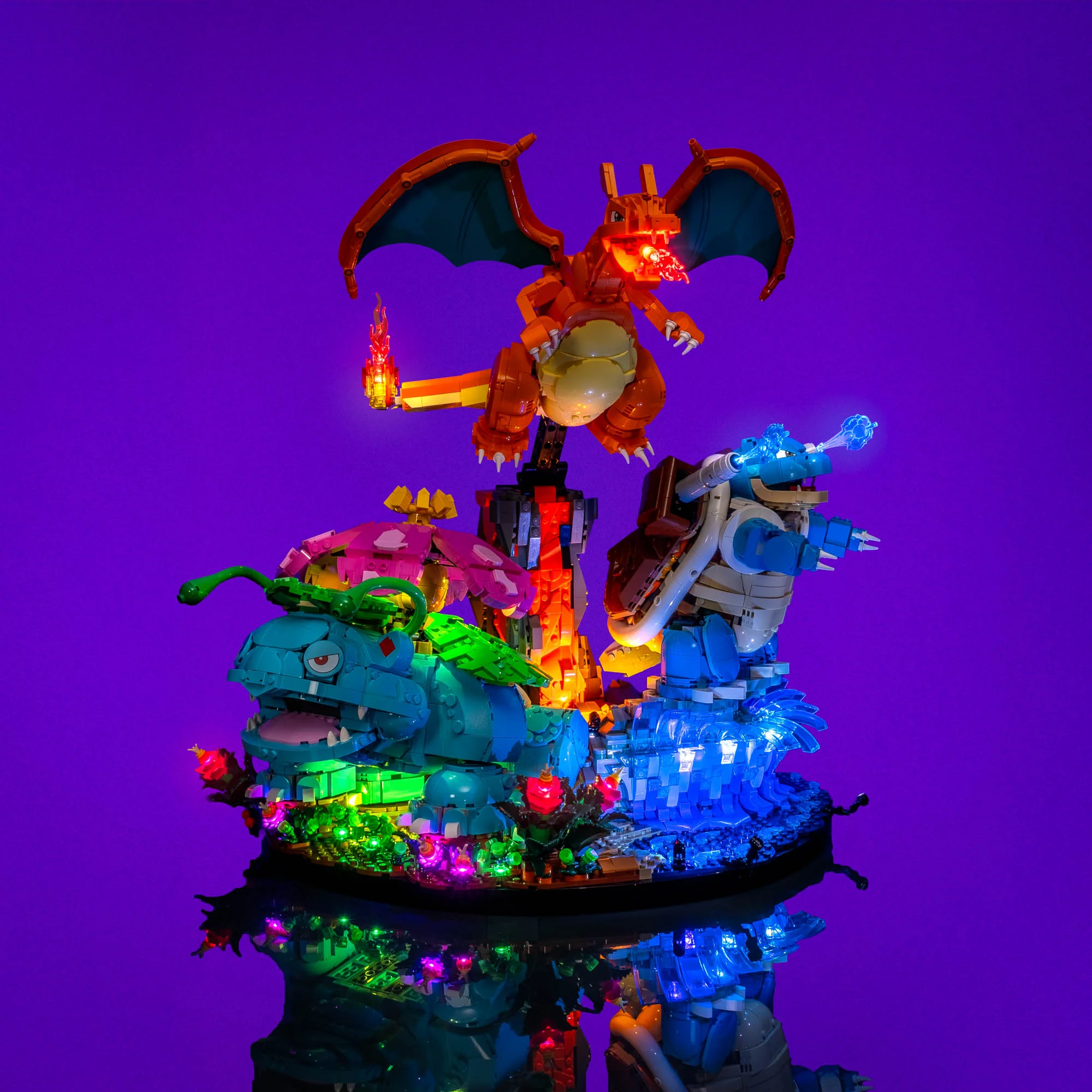 Bring your trio of Kanto starters to life with the Light My Bricks™ light kit for the LEGO® Pokémon™ Venusaur, Charizard and Blastoise 72153 set. This dynamic design keeps each Pokémon and its stand fully separable, so you can pose Venusaur, Charizard and Blastoise together in one cinematic clash or spread them across your shelves as individual heroes. Under Venusaur’s towering flower, pulsing green light floods the canopy, base and surrounding foliage, suggesting a Grass-type drawing pure power from the battlefield. Across from it, a flickering lavafall, blazing tail and glowing jaws turn Charizard into a restless firestorm, ready to unleash Flamethrower at any moment. Blastoise anchors the scene with cool blue pulses through its cannons and crashing wave effects at its feet, supported by crisp spotlights that sharpen every detail. However you arrange them, this light kit transforms the model into a dramatic, story-rich centrepiece for any Pokémon™ collection.